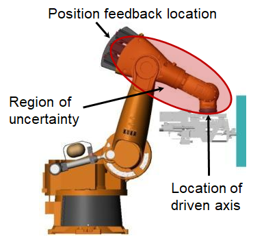 Robots have motors connected by linkages to their corresponding axes. Rotary encoders on the motor tell the controller where the end effector is in space. This creates positional uncertainty due to:
